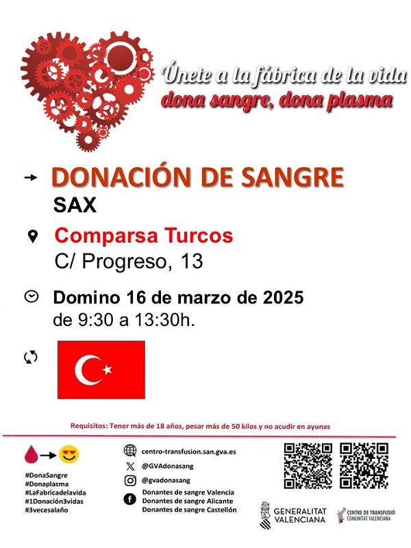 El Centro de Transfusión de Alicante estará el domingo 16 de marzo en horario matinal en la sede social de la Comparsa de Turcos, desde las 9:30 y hasta las 13:30 horas. Donde se anima a toda la población de Sax y foráneos para conseguir el mayor número de bolsas de sangre, ya que la donación de sangre es una necesidad social, para abastecer las necesidades de nuestra Comunidad y cubrir las necesidades de los hospitales zonales.