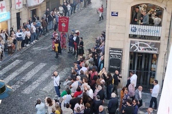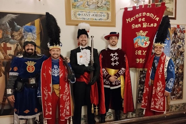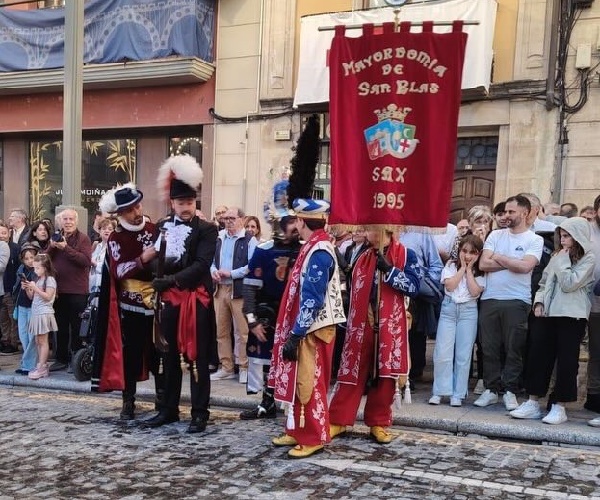 Cinco festeros sajeños ataviados con los trajes de las comparsas de Moros, Cristianos, Garibaldinos y Caballeros de Cardona, portando el estandarte de la Mayordomía, representaban a las fiestas de San Blas y a la villa de Sax. Los festeros protagonizaron una exhibición de arcabucería que anunciaba el Año Jubilar en Alcoy.