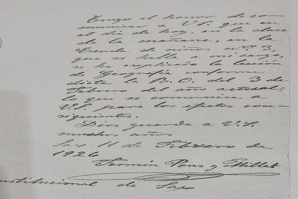 Y el tercer maestro, Fermín Pons, el 11 de febrero, escribe: “… en el día de hoy, en la clase de la mañana, en la Escuela de niños nº 3, que se halla a mi cargo, se ha explicado la lección de Geografía”.
