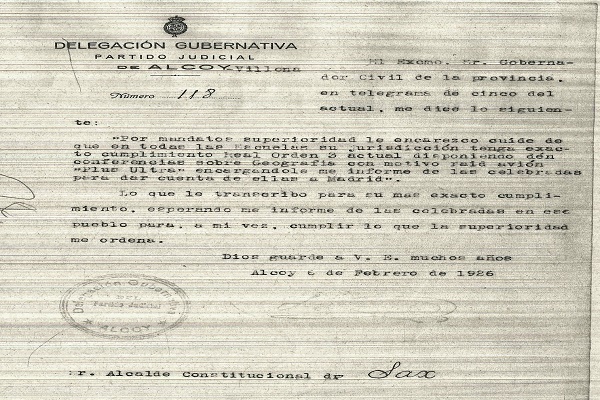 En el caso de Sax se conservan tres cartas de los maestros, dirigidas al alcalde, donde informan de las actividades llevadas a cabo en sus respectivas clases. Así, el 15 de febrero, el maestro Ramón Lario escribe: “Tengo el honor de poner en conocimiento V.S. que… en relación con el raid Franco y sus compañeros de Palos a Buenos Aires, procedí el día 11 del presente mes de dar a mis alumnos la lección de Geografía, con referencia a la ruta seguida por nuestros aviadores, relacionada con la que antes siguiera Colón, de acuerdo con la referente disposición”.