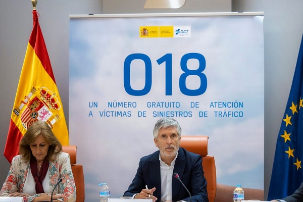 El ministro del Interior, Fernando Grande-Marlaska, ha presentado este jueves en la sede de la Dirección General de Tráfico el 018, un teléfono gratuito, accesible y con cobertura nacional, que atiende en más de cincuenta idiomas, accesible a personas con discapacidad y disponible los 365 días del año entre las 8:00 y las 21:00 horas para ofrecer información, orientación y acompañamiento a víctimas, familiares y personas allegadas ante las dudas o las dificultades que puedan surgir después del siniestro.