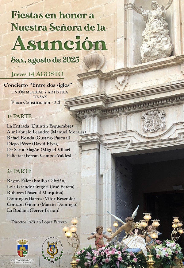 La villa de Sax volverá a celebrar las fiestas de la Virgen de la Asunción que arrancan el jueves 14 de agosto con el tradicional concierto a cargo de la Unión Musical de Sax que tendrá lugar en la plaza de la Constitución, a las 22:00 horas, bajo la dirección de Adrián López Estevan. Antes y desde la sede de la Sociedad Unión Musical y Artística de Sax saldrá la comitiva en pasacalle a las 21:30 horas hasta el lugar del concierto.