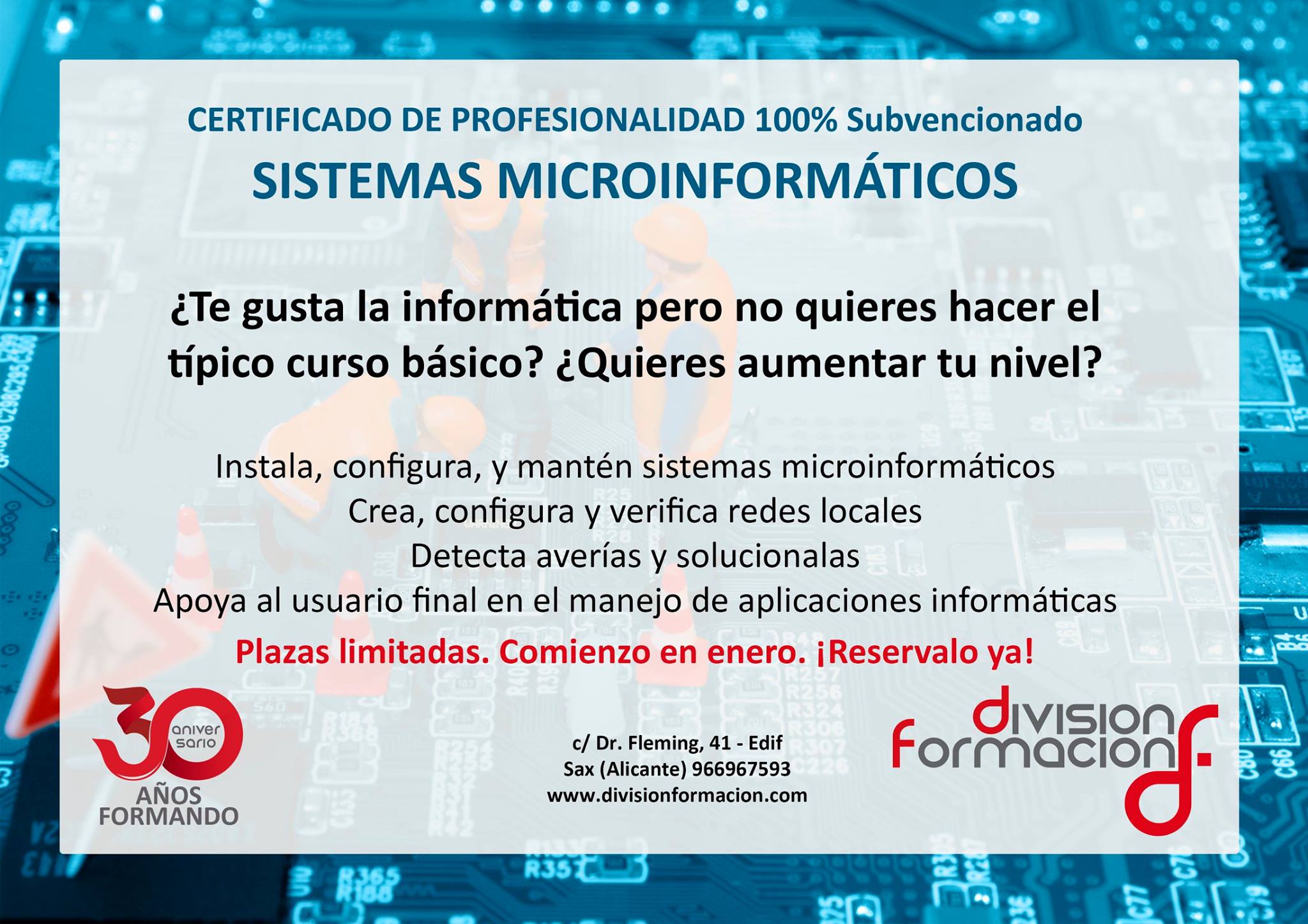 A la finalización del curso de Sistemas Microinformáticos, el alumno recibe el título de Certificado en Sistemas Microinformáticos. Las plazas son limitadas y subvencionadas al 100%, el comienzo del curso será en enero. El alumnado realizara prácticas reales en empresas. Esta acción formativa se imparte en modalidad presencial con una duración de 560 horas teóricas y 40 horas de formación práctica.
