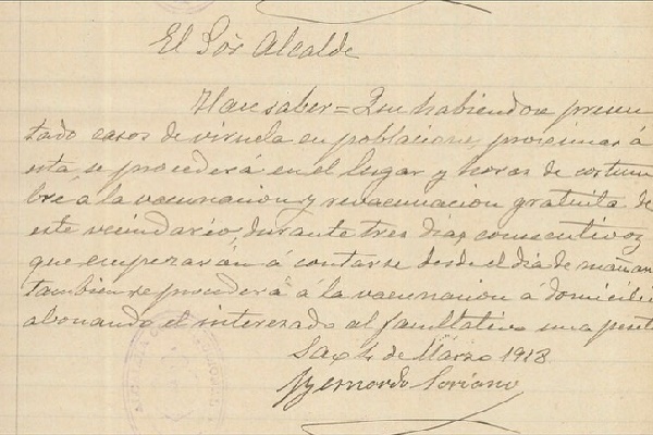 ​Hace saber= Que habiéndose presentado casos de viruela en poblaciones próximas a esta, se procederá en el lugar y horas de costumbre a la vacunación y revacunación gratuita de este vecindario, durante tres días consecutivos, que empezarán a contarse desde el día de mañana. También se procederá a la vacunación a domicilio, abonando el interesado al facultativo una peseta.